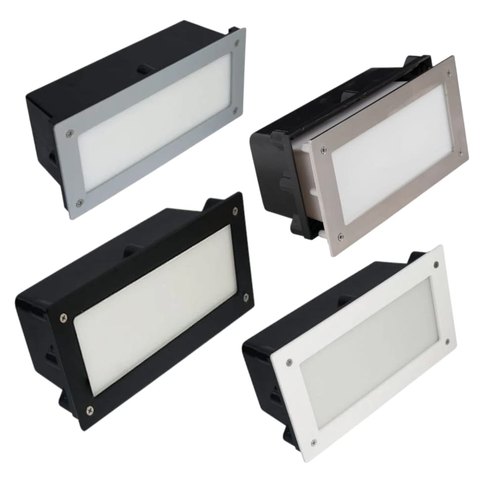 • Aro exterior, fabricado em Aço Inox ou em Policarbonato com acabamento dis- ponível na cor Branca, Preta e Cinza;